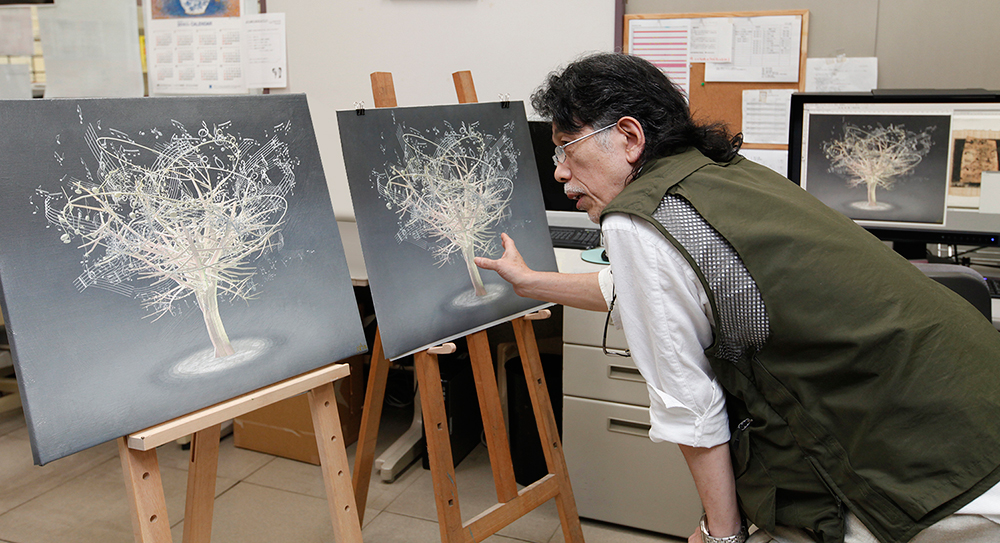 9色を使用する大判インクジェットプリンターにより、色再現領域を広げ、陰影をつけた立体的な表現を可能にし、油絵具のマチエール(質感)や、岩絵具の粒子などの原画の質感をリアルに再現し、耐光性にも優れた新しい版画表現手法“ハイファインジクレ版画”を開発しました。